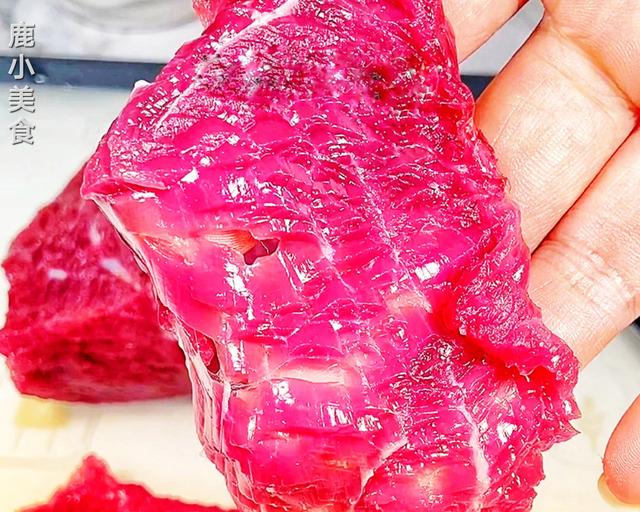(牛肉滑嫩的窍门一:“顺切猪肉逆切牛”,说的是切肉方式,牛肉所携带的肉筋较多,需要把牛肉横着纹理,逆着切把牛肉的筋膜切断,才能更易达到“爽嫩无渣还易咬”口感。)