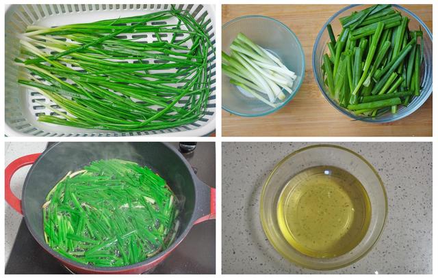 2、锅中倒一碗油,大火加热后转小火,开始炸葱,先炸葱白,再下葱叶,用小火慢慢的炸,炸到葱完全变色,有一点焦焦的,就可以出锅了,这时候葱里面的香味才完全炸出来,葱叶等下也是可以吃的;