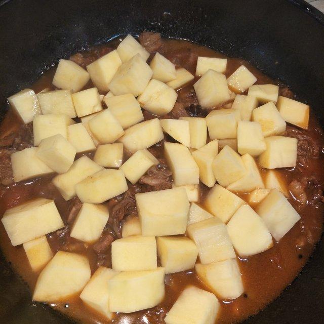 第5步、放牛肉炒香,倒入料酒,生抽,酱油翻炒。第6步、至牛肉全都变成红色,倒入一碗水再倒入西红柿,盖锅盖焖煮。大火烧开,转中火慢炖,我炖了将近一个小时第7步、再倒入控好水的土豆继续盖锅焖煮。直到土豆变烂,,倒入适量的盐,咸淡合适就可以出锅了!
